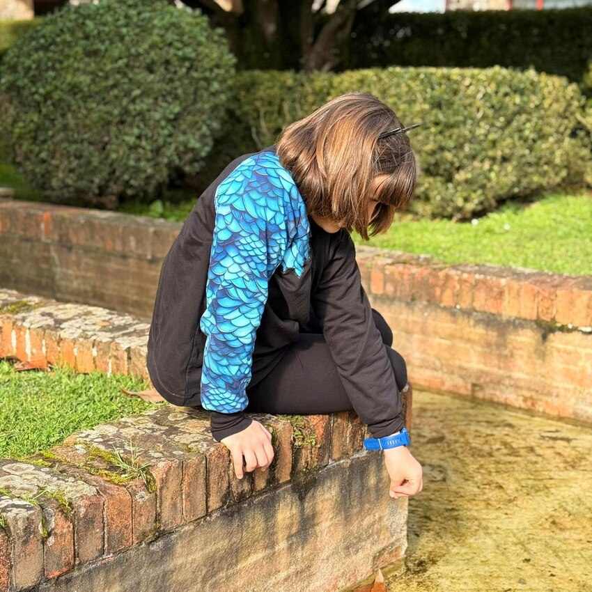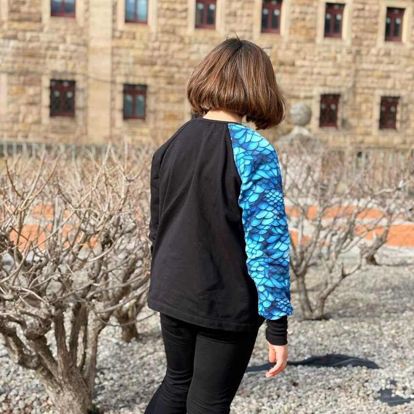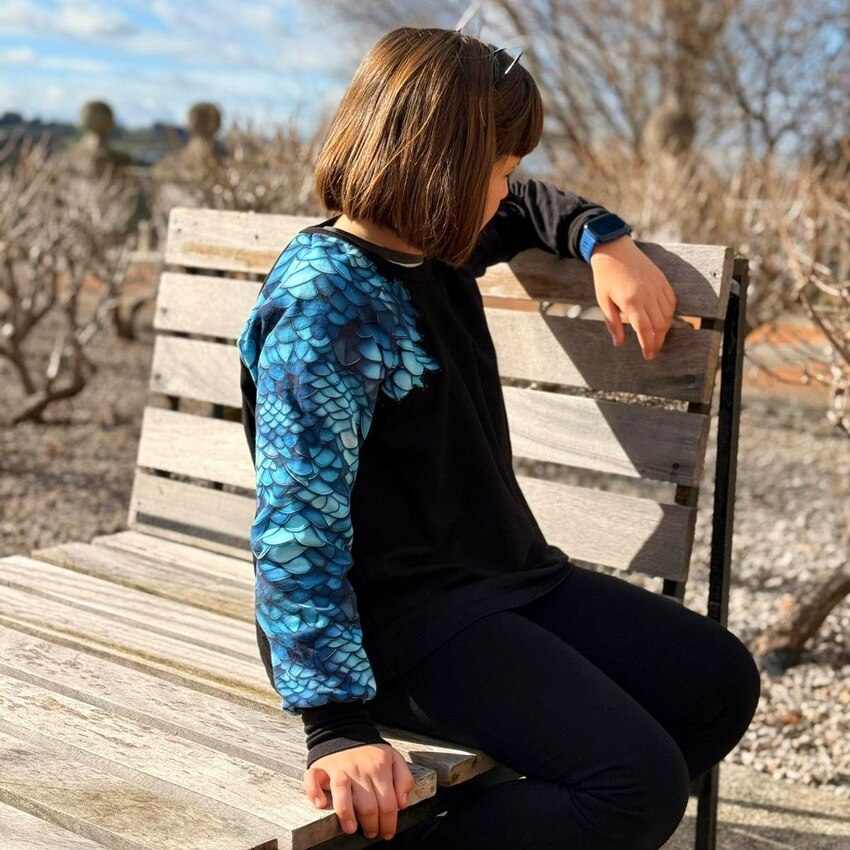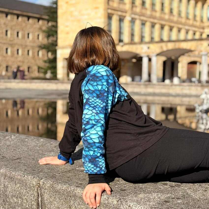 Se trata de una sudadera oversize negra, con una manga de dragón y un detalle bordado en la parte de delante muy especial. Parece que bajo la tela comienzan a desvelarse las escamas de un dragón poderoso que hay en ti y que se desarrolla luego en toda la manga derecha en un azul eléctrico y vibrante.